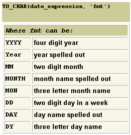 TO_CHAR FunctionYou can use the TO_CHAR function to customize the display of dates that are returned from a SQL SELECT statement. The TO_CHAR function has two parameters. The first parameter is the date that you want to convert. The second parameter is the format model, which specifies the way that you want the date to look when displayed. Many format models are available. A few are shown in the table below: