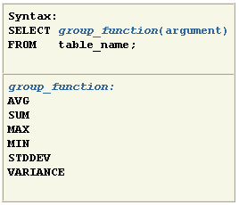 To specify a group function, you write the name of the function followed by an argument in parentheses. The argument can be a column name, an expression, or a constant.